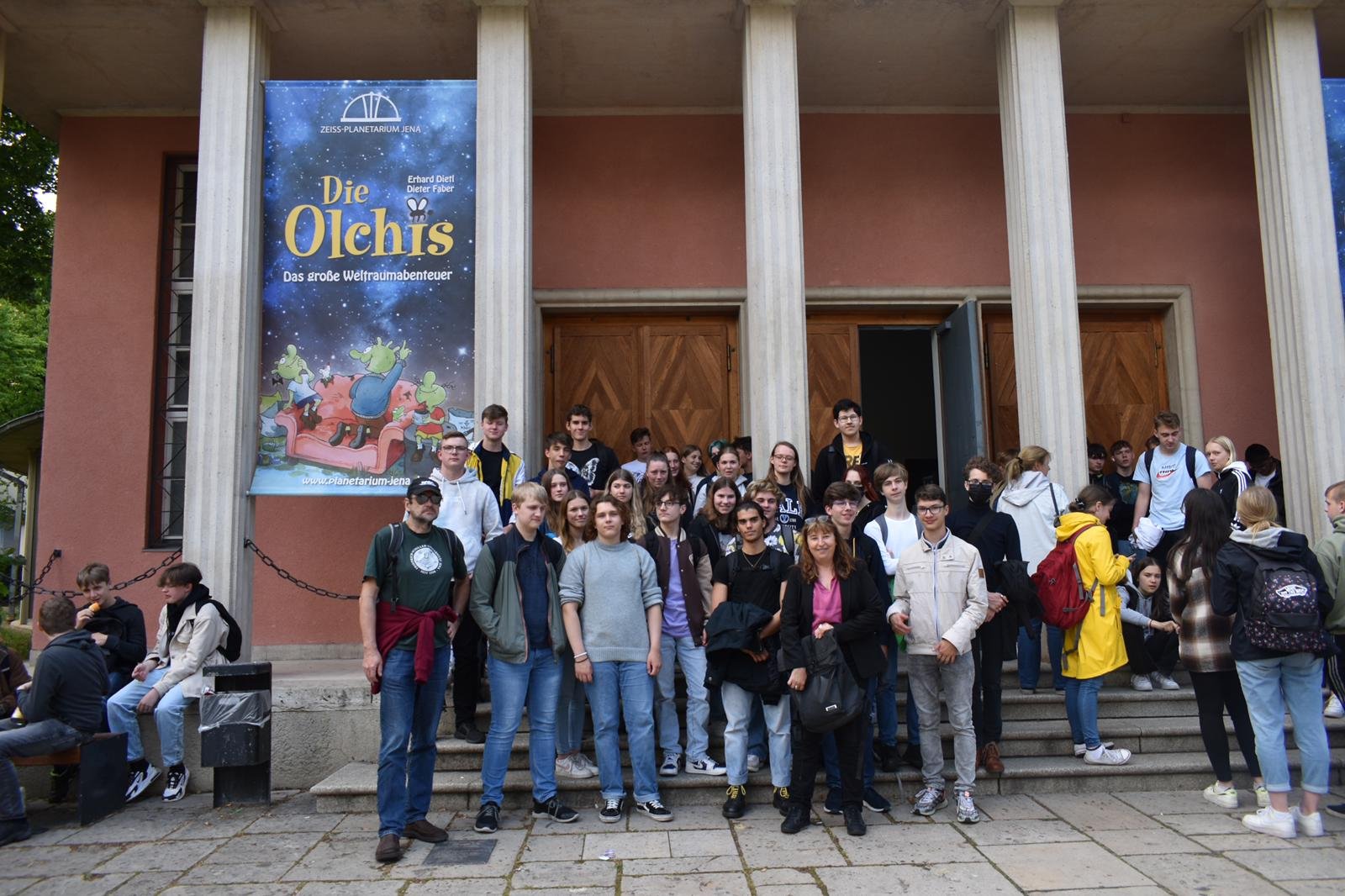 Auf dem Weg nach Jena hörten wir wieder schöne Vorträge. Über Carl Zeiss, den Sport in Jena, die Friedrich-Schiller-Universität (wo auch Fr. Home und Hr. Home studiert haben) und vieles mehr. Gegen 11 Uhr waren wir dann in Jena. Knapp zwei Stunden konnte man sich die Stadt anschauen, etwas Essen gehen und mit Freunden Spaß haben. Nach den mannigfaltigen Erfahrungen im Zentrum von Jena kam 13 Uhr das Highlight des Tages: Das Zeiss-Planetarium. Dort haben wir uns in Sessel gesetzt und nach oben geschaut. An die kuppelförmige Decke wurde eine kleine Zeitreise als 360°-Film projeziert. Insgesamt hat ein Vergleich zur anschaulichen Erläuterung der Zeiträume gedient: Die Geschichte des Universums und der Welt wird auf die Zeit eines Jahres verkürzt vorgestellt. Man konnte die Milchstraße sehen, etwas über Sternzeichen und Sternbilder lernen und die Zeit vom Urknall bis zum Menschen nachverfolgen. Als aufregendstes Erlebnis des Films war für viele die Entstehung der Erde. Zum Abschluss ging der Film punktuell auf die Entwicklung des Menschen bis in die heutige Zeit ein. Als wir aus dem Sonnenobservatorium wieder hinauskamen, fühlte es sich alles an wie ein Traum. Es war ein schönes und ent(spannendes) Erlebnis. Auch vor dem Gebäude gab es ein Gruppenbild.