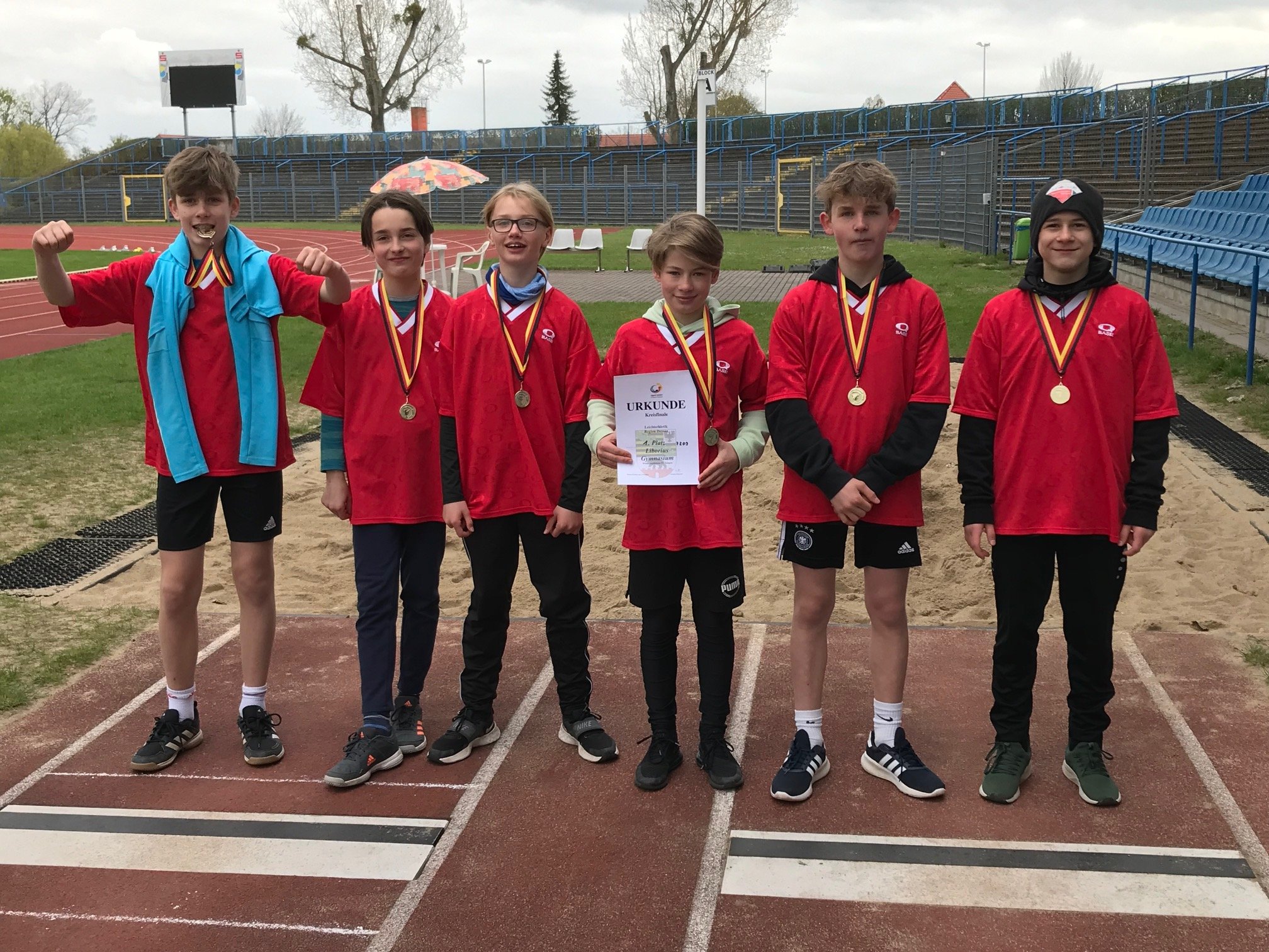 Die Mädchen und Jungen der WK IV haben sich beim Kreisfinale in Dessau gegen fünf weitere Schulen durchgesetzt und sind damit ins Regionalfinale gesprungen und gelaufen. Bei kühlen Temperaturen lagen die Jungen vor dem 800m-Lauf noch auf Platz 2 hinter der Biethe-Schule und konnten durch großen Kampfgeist und Ausdauer am Ende den 1. Platz belegen. Bei den Mädchen sorgten Sophia mit 47m im Schlagballweitwurf und Helena mit 4,24 im Weitsprung für herausragende Ergebnisse.